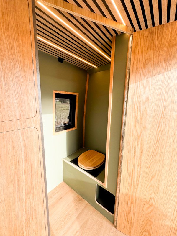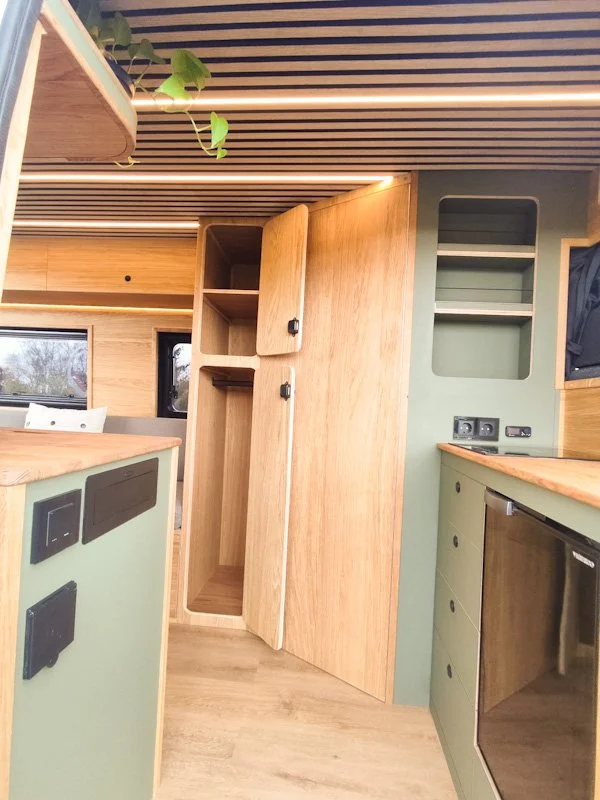 Citroen Jumper, urgemütlich und mit Holz ausgebaut, in Eiche und warmen grün. 240W Solar und starke Bordbatterie ermöglichen komplett autarkes Stehen auch außerhalb von Campingplätzen. Emil ist ein Stauraumwunder: überall Hängeschränke und zusätzlich ein Kleiderschrank mit Kleiderstange sowie Heckgarage zum Durchladen langer Campingmöbel. Neben einem riesigen Toilettenraum hat Emil eine U-Sitzgruppe, die in kürzester Zeit zum Längsbett umbaubar ist (200*180/125). Die dimmbaren LED Leisten in der Decke und unter den Hängeschränken zaubern ein urgemütliches Ambiente. Standheizung und Warmwasserboiler sorgen für angenehmen Komfort auch an kälteren Tagen. Bei Hitze kühlt der Maxxfan Deckenventilator.